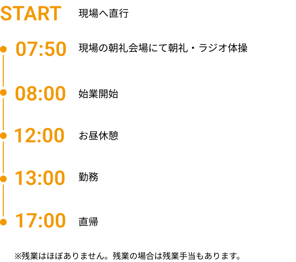 | 勤務時間 | 8:00-17:00 ※現場によって前後します ※休憩60分 ※残業ほぼなし |